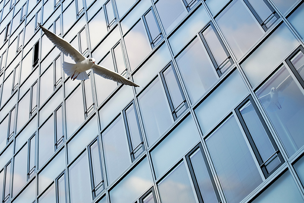 Während Glas für uns transparent oder spiegelnd wirkt, erkennen Vögel große Glasflächen oft nicht als Hindernis. Das führt leider häufig zu schweren Zusammenstößen. Um dem vorzubeugen und die Vögel zu schützen, verwenden wir die Vogelschutzfolien von BRUXSAFOL. Dies sind speziell entwickelte Folien, die Glasflächen für Vögel sichtbar machen.
